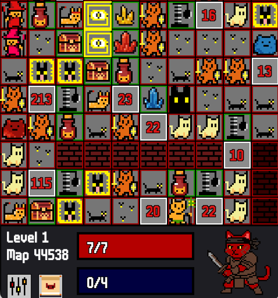 Cathulusweeper is a grid-based puzzle game that combines Minesweeper-style deduction with light RPG mechanics. Each revealed number indicates the sum of levels of adjacent hostile creatures, not a simple mine count. Use this information to infer which tiles are safe to open.